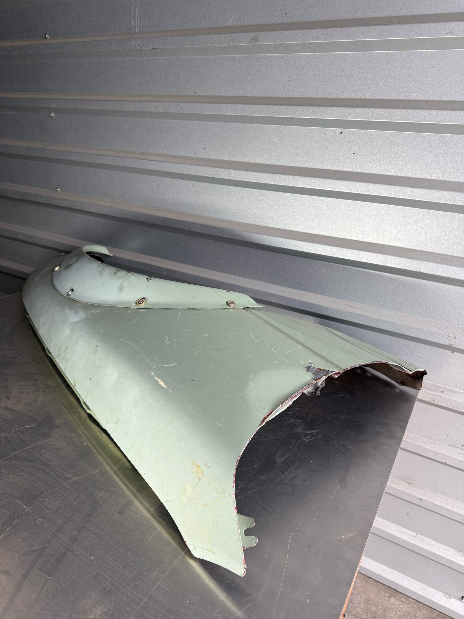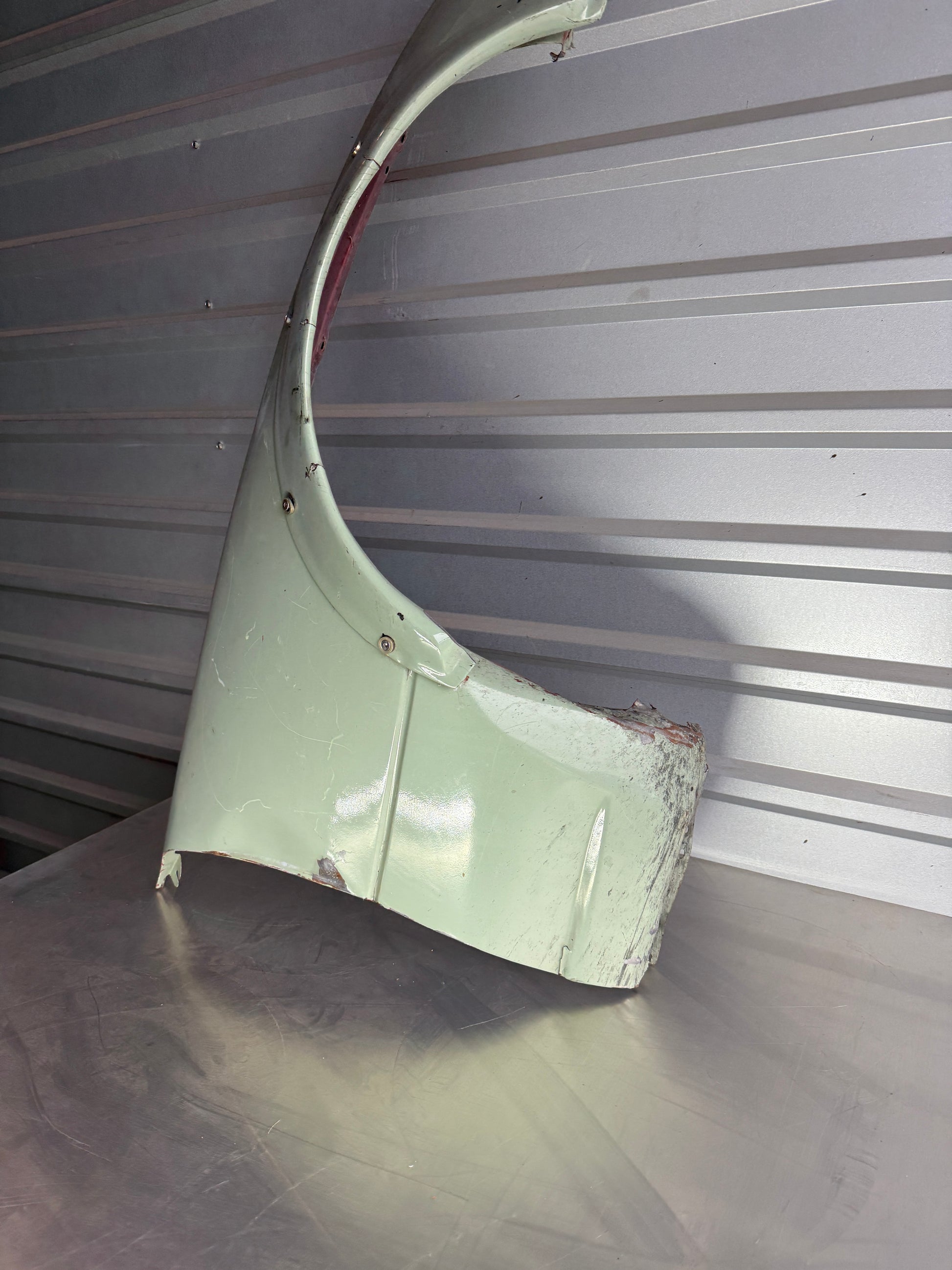 Green OEM passenger-side widebody fender removed from a 1990 NA Mazda Miata.