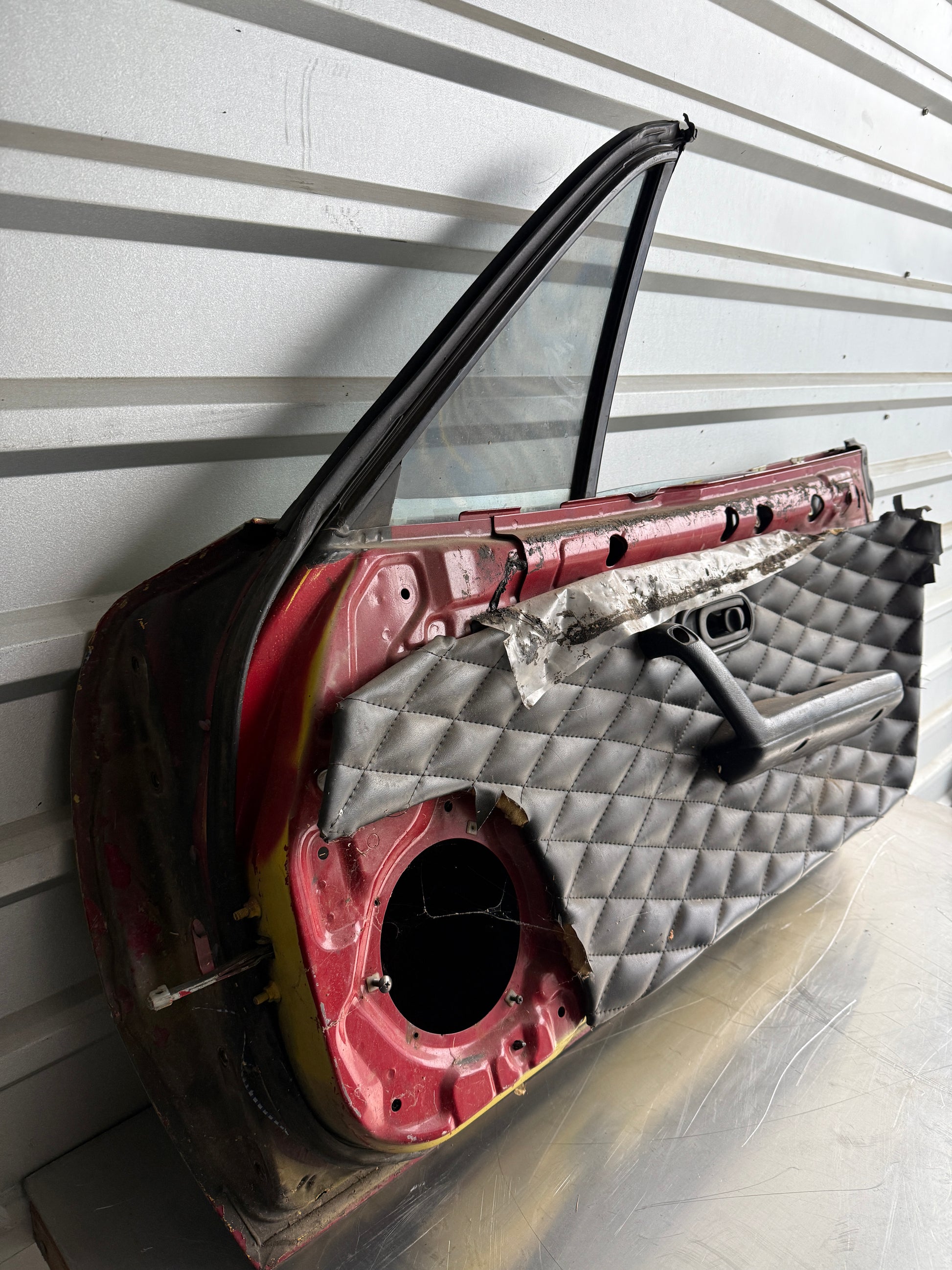 Tan OEM passenger side door assembly removed from a 1990 NA Mazda Miata.